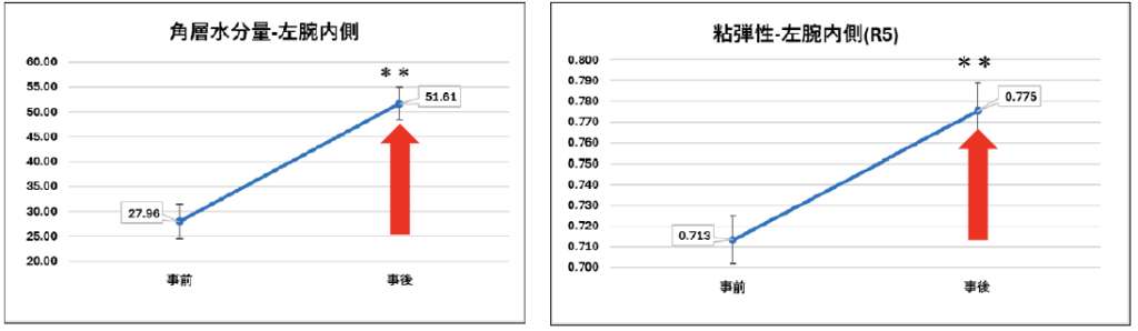 | 結果 | ・角層水分量: 摂取4週間後に有意に増加(改善) ・肌の粘弾性: 摂取4週間後に有意に向上(改善) ・主観的評価(VAS): 肌のたるみ,ハリや弾力,乾燥,つや,透明感,シミやそばかすの6項目で有意に改善 ※備考: 試験期間中、食品に起因する有害事象は認められなかった。 |