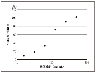 第三者機関でヤナギラン抽出物及びエノテインBの抗糖化機能について検証をおこった結果、ヤナギラン抽出物は、最終糖化産物(AGEs)の産生を濃度依存的に抑制しました。