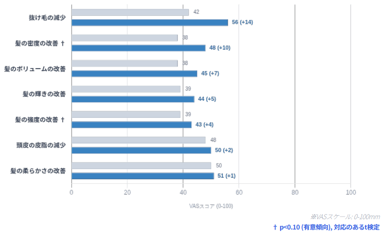 | 結果 | ・髪・頭皮VAS:「髪の密度の改善」「髪の強度の改善」項目増加(有意傾向) ・他:「抜け毛の減少」「髪のボリュームの改善」項目が大幅にポイント増(+10pt以上) |