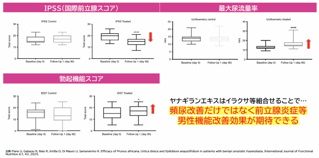 ヤナギラン抽出物はアフリカスモモ、イラクサ根と組み合わせることで、抗炎症作用・抗アンドロゲン作用・抗酸化作用が相乗的に働き、尿路の問題を解決するだけではなく、前立腺炎症改善による男性性機能の問題を改善する可能性が示唆されます。