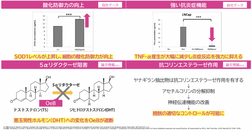 前立腺肥大症や夜尿症の緩和は、ヤナギラン及びエノテインBの抗酸化、抗炎症作用、ホルモンバランス調整機能によるもの。自社データ以外にも複数の上質な論文で当該機能が示されています。
