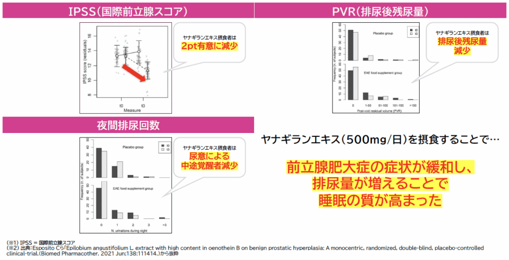ヤナギラン抽出物の前立腺肥大症(BPH)からの保護機能の有効性が確認できました。排尿後残尿量が減少することでの「スッキリ効果」、夜尿症の各症状が緩和することにより、睡眠をはじめ生活の質の向上効果があることが実証されました。